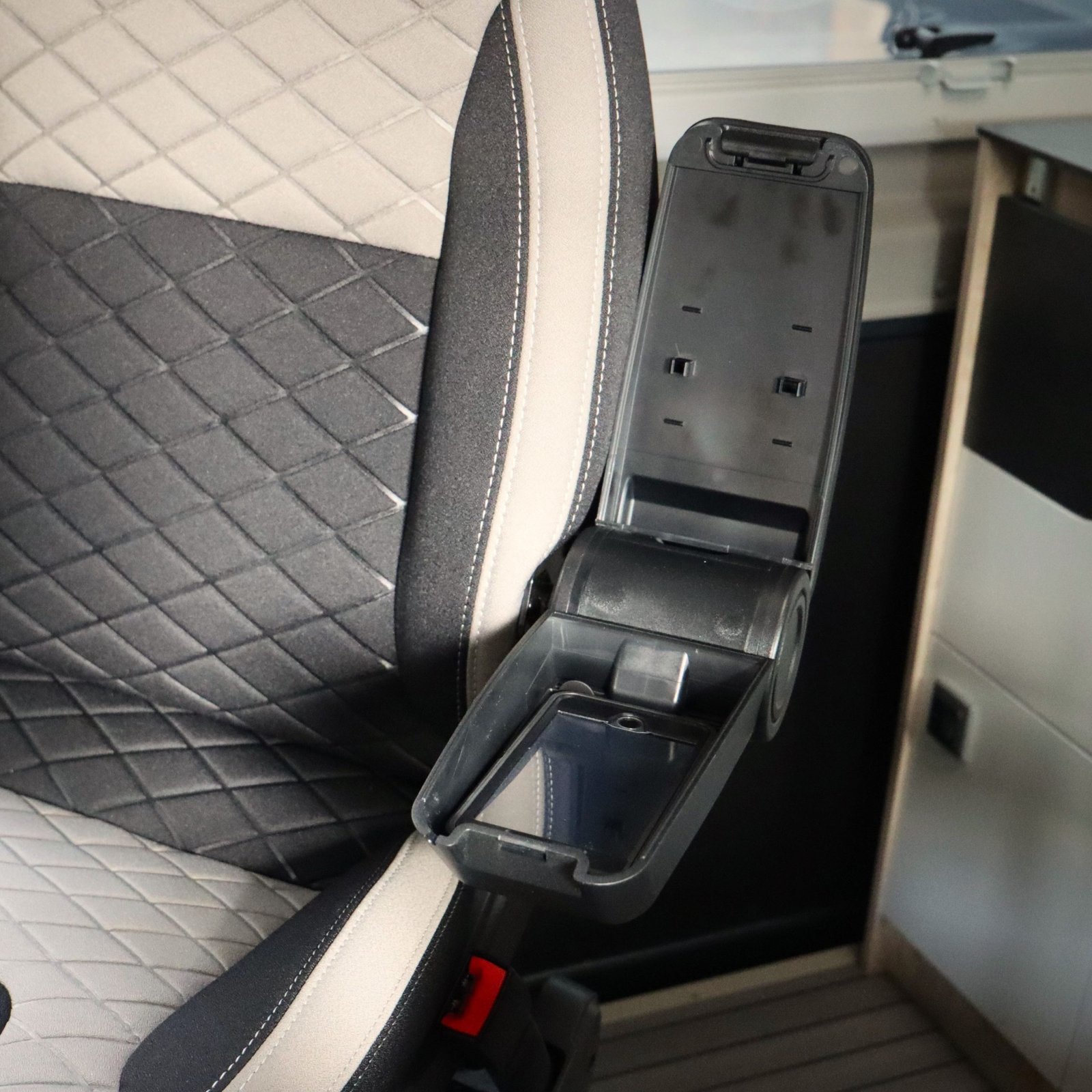 Our Fiat Ducato armrest is the epitome of comfort and convenience, offering seamless height adjustment and soft padding. It’s foldable between the seats when not in use and includes a sizeable 1-litre storage compartment with a noise-reducing TPE insert and pen holder, adding functionality to your armrest.